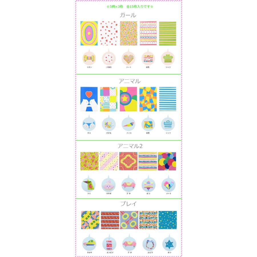 テーマ毎に4種類あり、それぞれ5柄×3枚ずつと9種類の折り方の説明書が入っています。