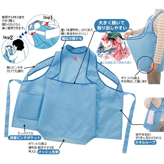 おなかのところに大きなポケットがついているエプロンで、洗濯機から洗濯が終わった衣類をこのポケットにIN。
