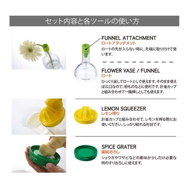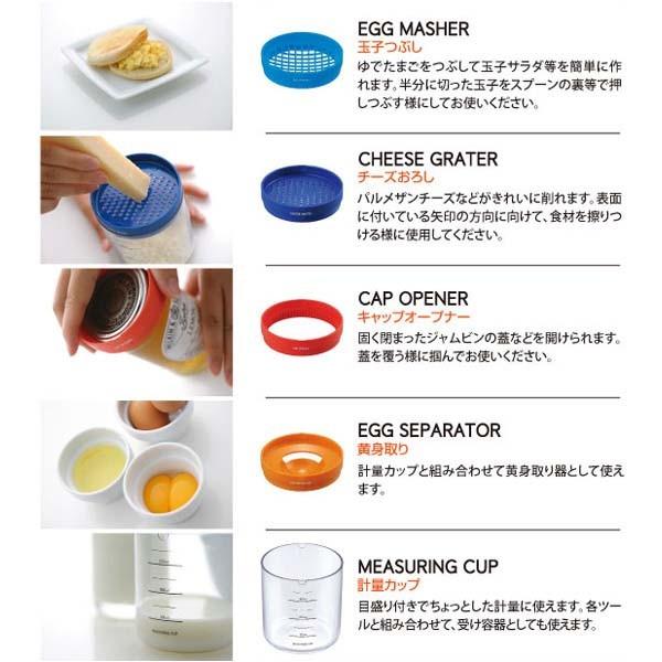 計量カップやレモン搾りなど出番の多そうなものから、玉子つぶしやチーズおろしなどあれば便利だけどなかなか単品では買う機会を逃しそうなものまで。