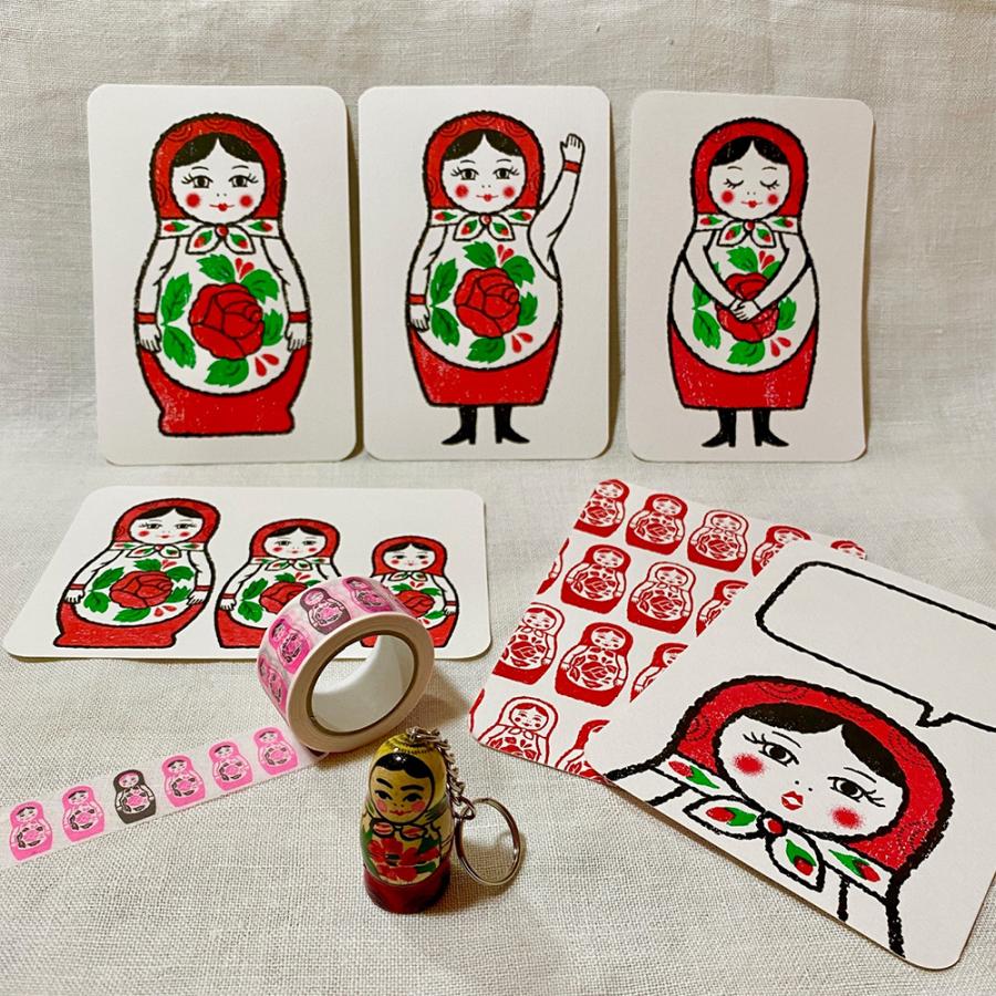 オリジナルのポストカード、マスキングテープ、ロシアのキーホルダーがセットになったもの。