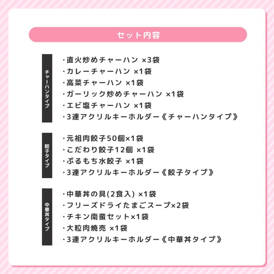 チャーハンタイプ、餃子タイプ、中華丼タイプの3種類があり、福袋の中の惣菜もそれぞれメニューが違います。